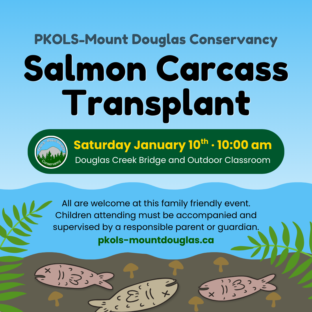 Join the PKOLS-Mount Douglas Conservancy to help restore the ecological balance of Douglas Creek by transplanting salmon carcasses back into the ecosystem. This hands-on activity supports the recovery of this important salmon habitat and provides an educational experience for all … Continue reading →