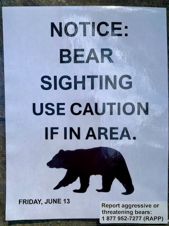 Bear notices have been posted at Mt. Douglas Beach and on Churchill Drive, in PKOLS – Mount Douglas Park.